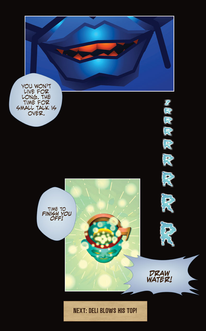 While the battle continues, the evil urn Deli startles our heroes from behind. The villain seems to be reformed … but not in a good way! Will Tiqwah and Etgar find what they’re looking for in the aural grid before it’s too late?